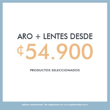 Obtenga hasta un 50% de descuento sobre precio regular en la compra de AROS Y/O ANTEOJOS DE SOL. Promoción no aplica en las marcas Prada, Prada Rossa, Cartier y Persol. Descuento válido para producto de menor valor. Descuento no aplica en líquidos y/o accesorios. Descuento no acumulable con otras promociones y/o descuentos. Promoción válida del 25 de junio al 30 de setiembre del 2025 en tiendas físicas y www.opticasvision.co.cr