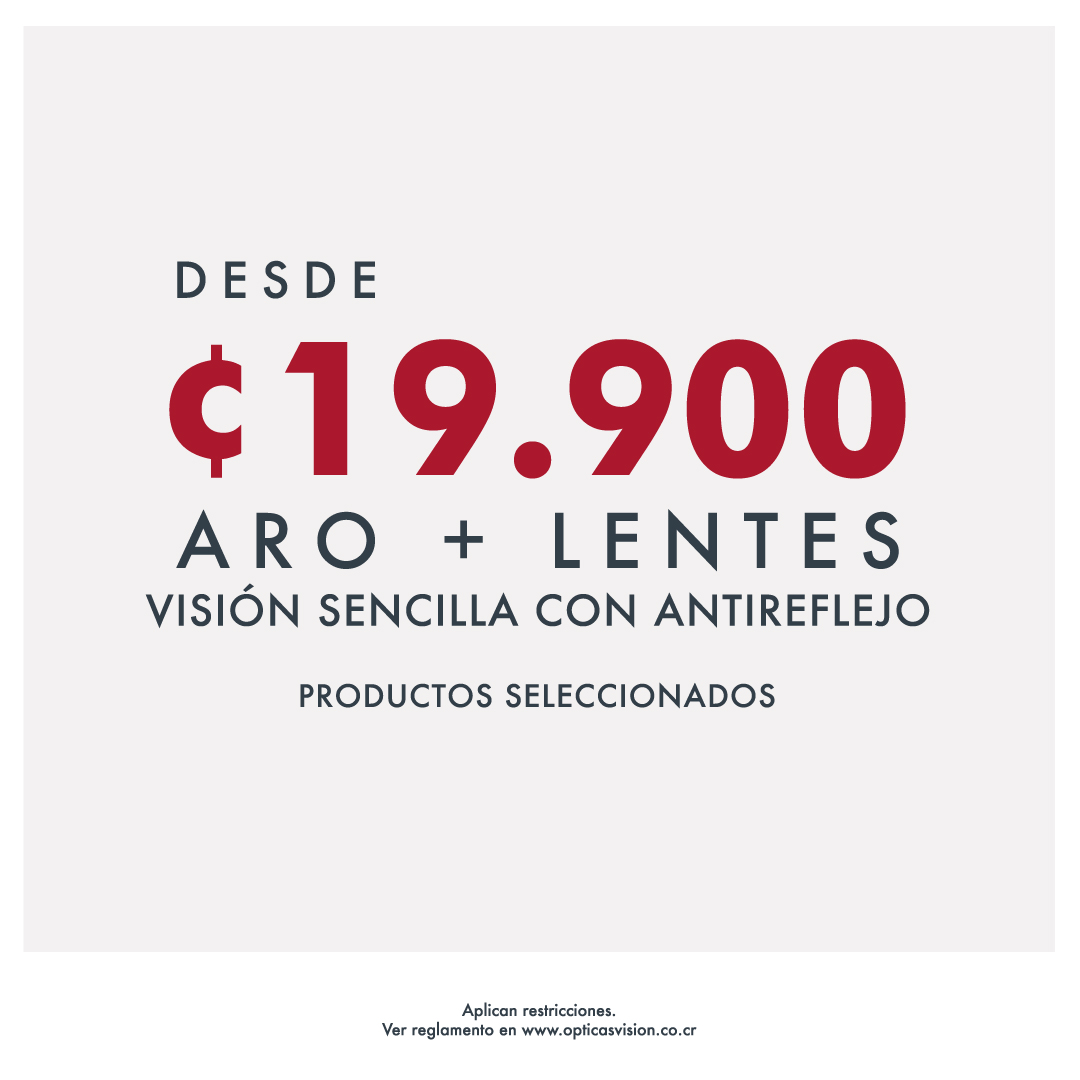 El beneficio consiste en obtener a un precio especial un combo que incluye: examen de la vista, aro (de acuerdo al listado), lente Visión sencilla, POLY con Antireflejo por el monto de ¢54.900, promoción valida del 29 Agosto de 2024 al 31 Diciembre del 2025. no aplica ni se puede combinar con otras promociones o descuentos, ni se le podrá aplicar ningún otro tipo de descuento o facilidad de pago como convenios o tasa cero. Aplica para marcas Chaps y Jack y con etiqueta productos seleccionados Armani Exchange, Arnette, Ralph y Vogue. Ver reglamento en www.opticasvision.co.cr
