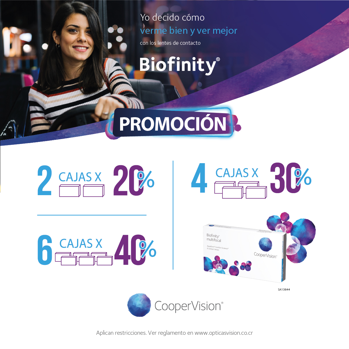 Obtenga un 25% de descuento por la compra mínima de 2 cajas de Lentes de Contacto o obtenga un 40% de descuento por la compra de mínima de 4 cajas de Lentes de Contacto en las marcas participantes *Biofinity Esférico, Biofinity Tórico & Biofinity Multifocal*. (Se excluye de la promoción Biofinity Tórico XR) Oferta válida desde el 10 de julio hasta el 31 de diciembre de 2025 o hasta agotar existencias. Oferta disponible en tiendas tanto física como en la tienda virtual en Costa Rica. Se requiere un examen visual o receta vigente para el despacho de lentes de contacto. Se pueden combinar productos de la misma marca Biofinity. No hay límite de compra de promociones por persona. No aplica con ningún otro descuento o convenio. No aplica con líquidos y/o accesorios. Ver reglamento en www.opticasvision.co.cr