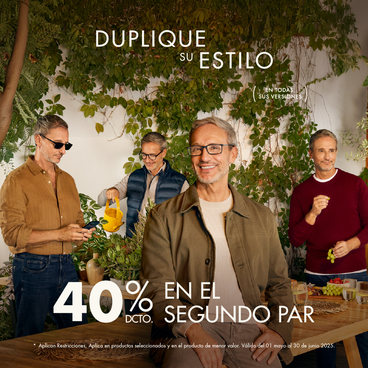 Obtenga con su cupón, un 50% de descuento sobre precio regular en la compra de la Segunda unidad en las siguientes combinaciones: “ARO CON LENTES + ARO DE SOL”, “ARO CON LENTES + ARO CON LENTES”, “ARO DE SOL + ARO DE SOL”. Descuento válido para producto de menor valor. Descuento no aplica en líquidos y/o accesorios. Excluye marcas: Prada, Prada Rossa, Cartier y Persol.